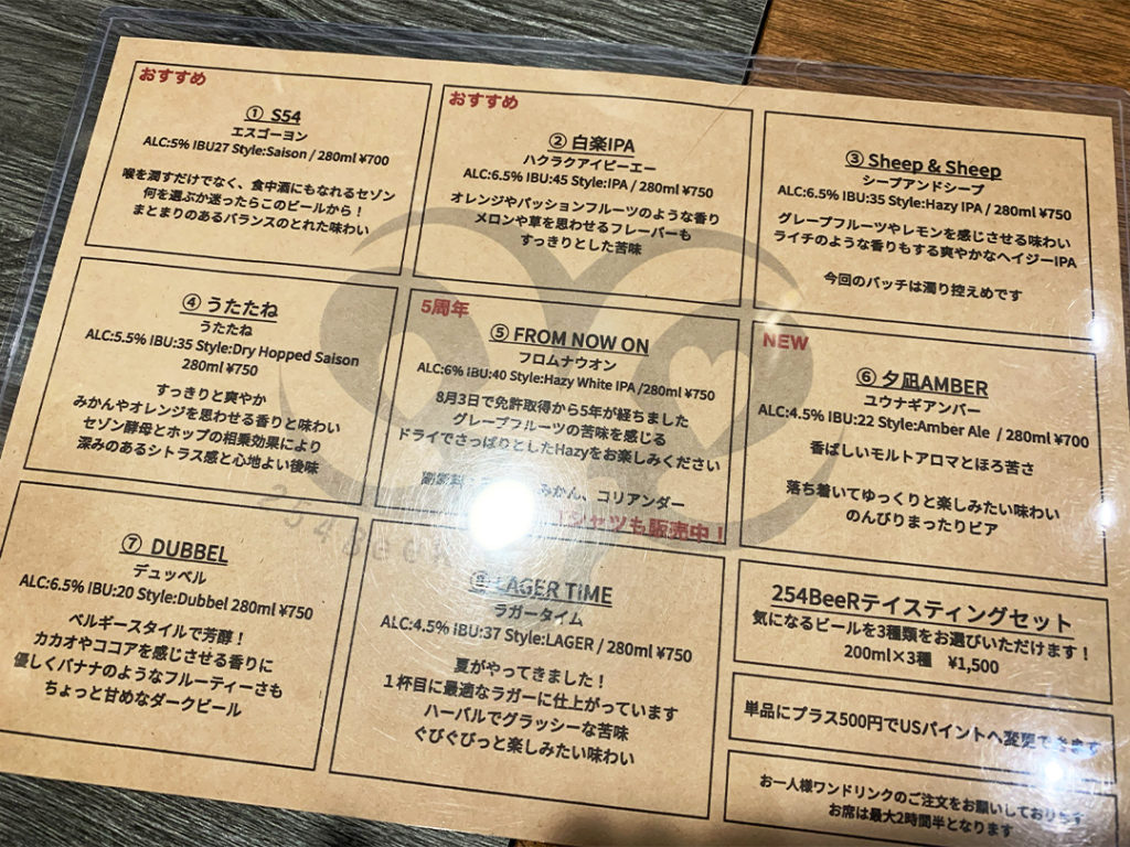 気になるビール3種類が飲める「254BeeRテイスティングセット」を注文し、① S54、④うたたね、⑤あかむぎを飲みました。初夏にさわやかなSaisonを一杯目に。とにかく美味しい!