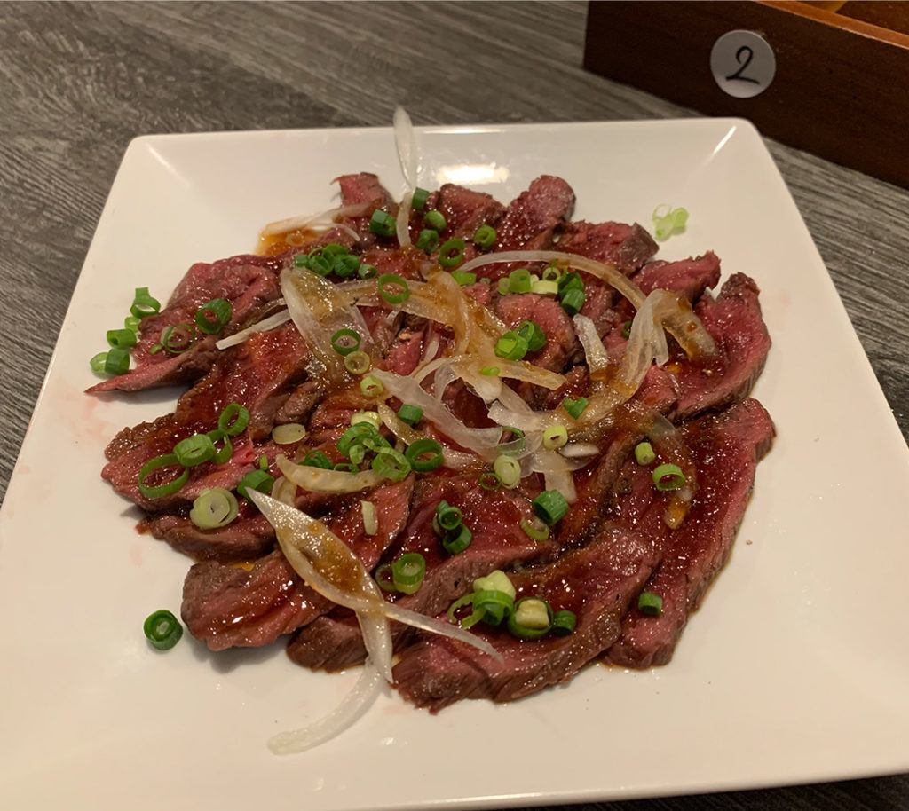 こちらは「馬肉のたたき 特製ポン酢ソース」(1,000円)。薄切りにした馬肉とポン酢がよくあいまs.
