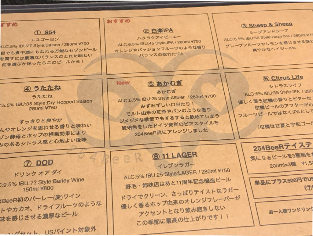 2023年8月頃に訪れた際のメニューです。()内はビアスタイル。