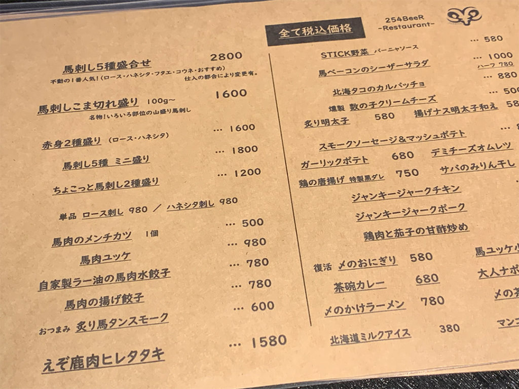 お料理は、馬刺しを中心としたメニュー。とにかく驚くほど馬刺しが美味しく安い!ビールも美味しいのですが馬刺しを食べるならこのお店!というほど、馬刺しが美味しいんです。