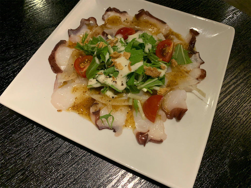 「北海タコのカルパッチョ」(880円)。馬刺しも美味しいですがタコもぷりぷりでうまい!